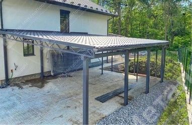 - Навес на металлическом каркасе, покрытый металлочерепицей. Готовая конструкция получается прочной и при этом смотрится эстетично. Благодаря свойствам металлочерепицы навес прослужит долго и не потребует сложного ухода. Чаще всего подобные конструкции заказывают в качестве навеса над парковочным местом. В этом случае достаточно, чтобы навес имел минимальную ширину в 3 метра. Конструкция не занимает много места и при этом надежно защищает авто;